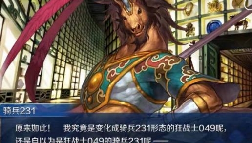 比如说下面这一张图是赤兔马的一段话:“原来如此,我究竟是变化成骑兵231形态的狂战士049呢,还是自以为是狂战士049的骑兵231呢?”