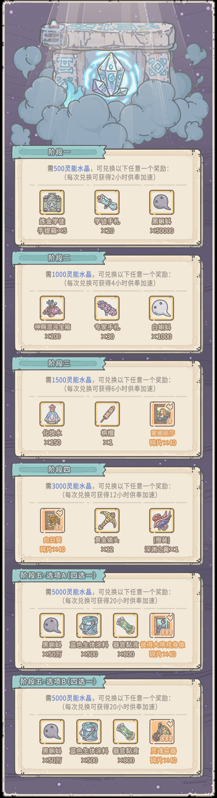 5、使用供奉加速1小时,每次获得6灵能水晶,上限200小时,合计获得1200灵能水晶