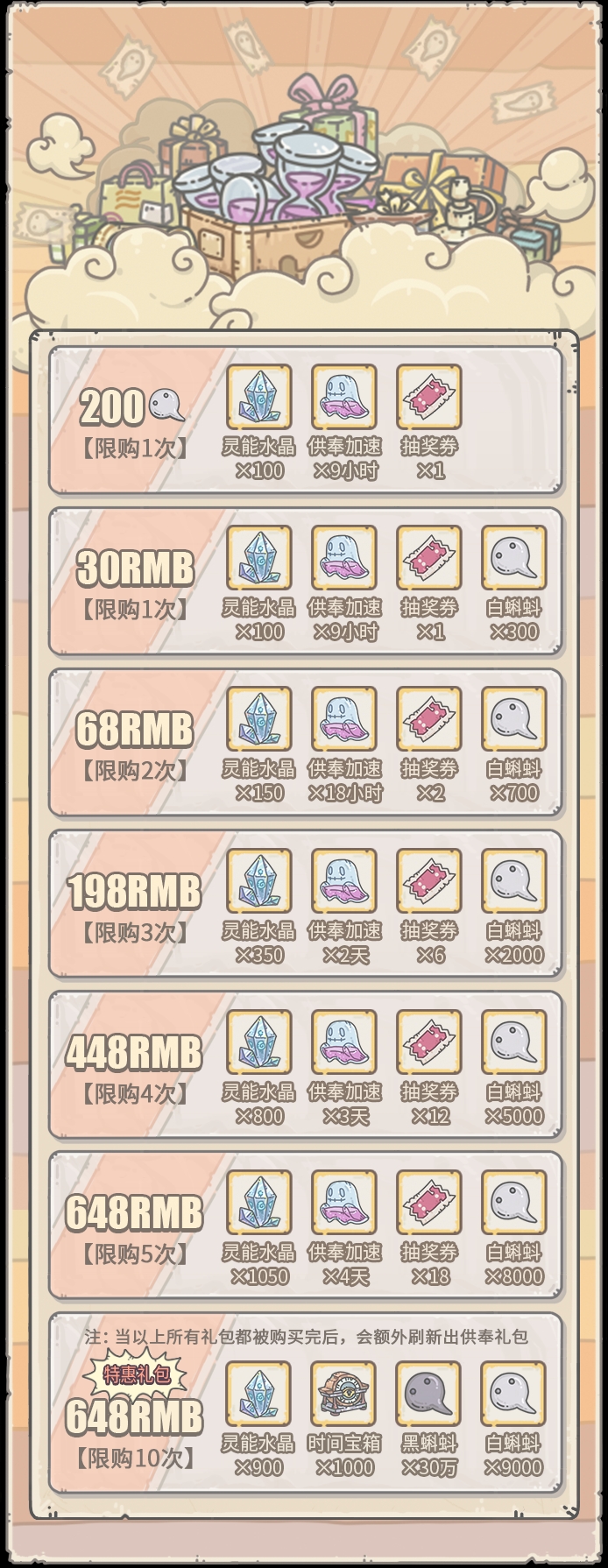 活动期间,贩售机将出现福利礼包,每天5点刷新,售价1白蝌蚪。内容为:供奉加速×30分钟、开发者的灵魂×1、灵能水晶×100
