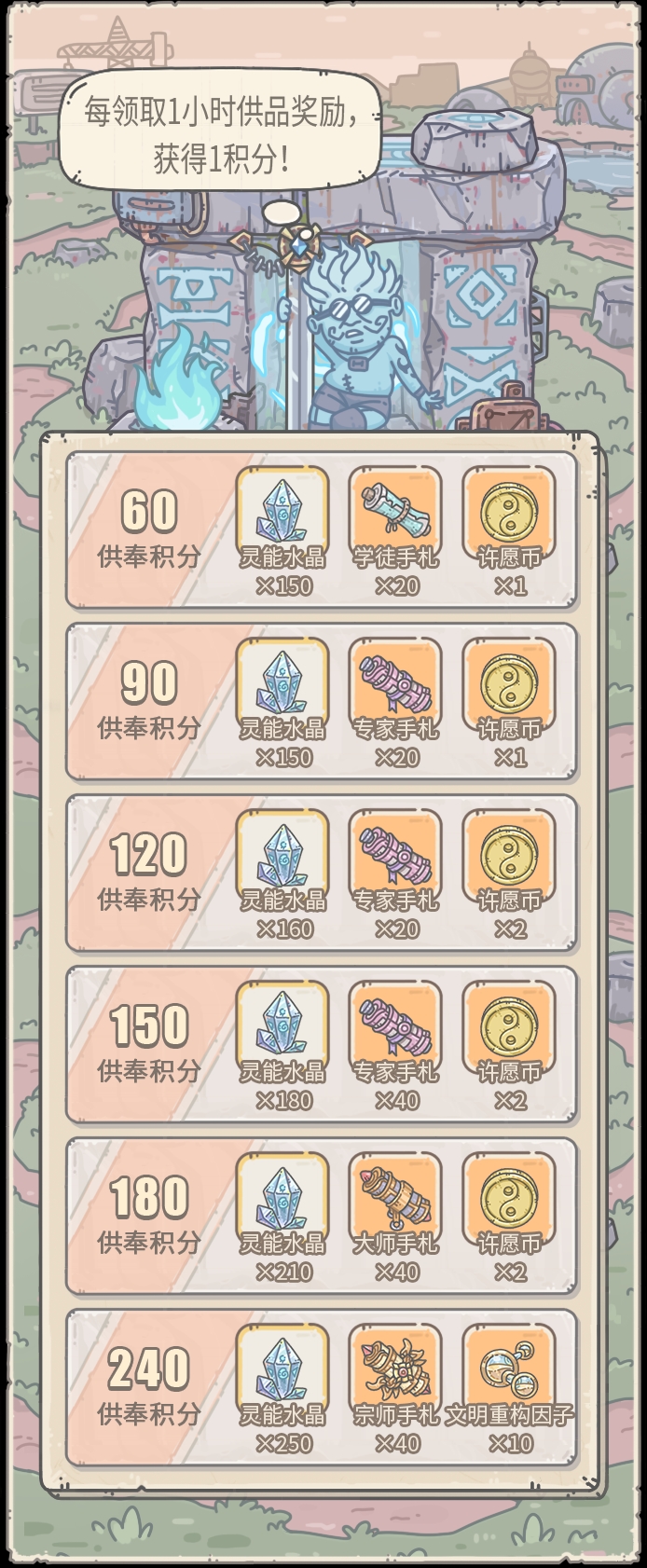 活动期间,每次领取供奉奖励,根据祭品原始的供奉时间,获得活动积分(1小时=1积分)累积对应的活动积分,可获得以上奖励。