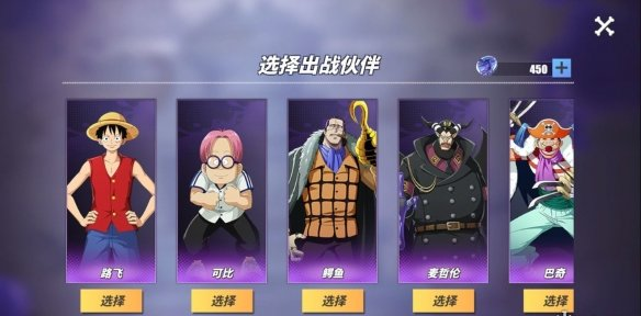 初始可以使用路飞,另有可比、鳄鱼、麦哲伦、巴基、Mr.2、Mr.1,可以通过推进城历练币解锁,历练币可以通过每日登陆、每日任务、角色通关任务获得。