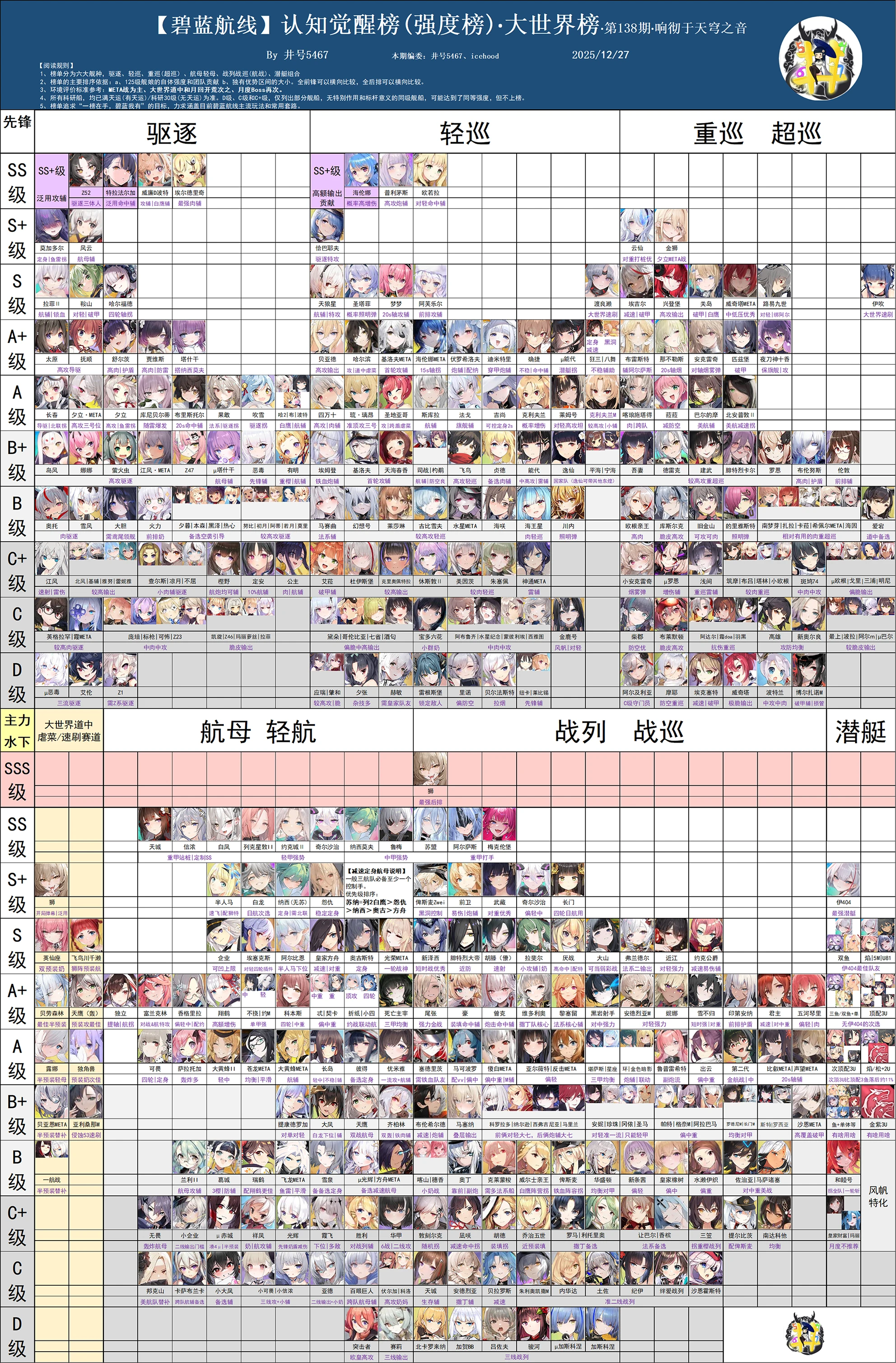 大世界方面,泛用攻辅,白鹰必备攻辅,轻甲和重甲都有机会登顶。