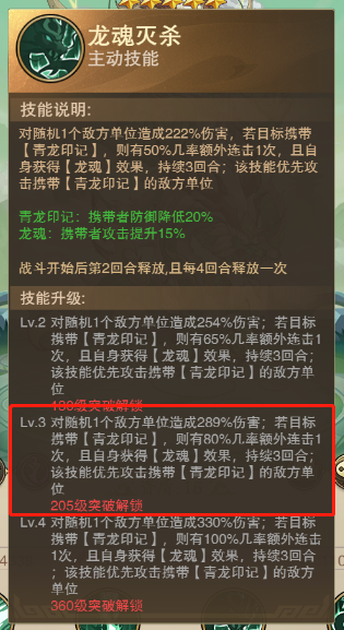 这个技能不仅有着较高的倍率,更有着极高的连击概率,还能为自己附加15%攻击提升的效果。经过测试,青龙的连击概率是非常高的,基本是对面有的buff就能连击,而且被动攻击增加效果在连击时就可以吃到加成,极大地加强了青龙的爆发。 该技能能在205级(lv3)的伤害期望为(不计算攻击加成)520%。同级穷奇的伤害期望仅455%。可以说第二回合的青龙可以撕开任何看似坚固的防线,但是这一切建立在青龙能够把印记保留在第二回合的基础上。