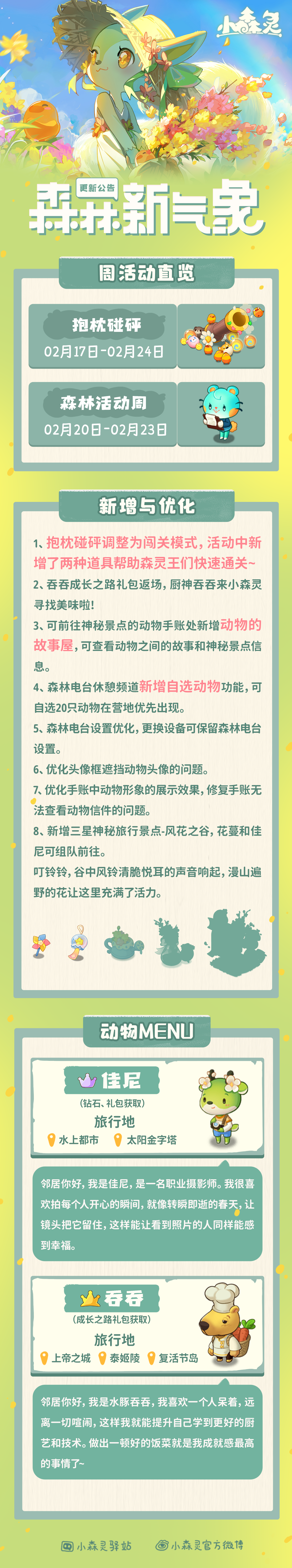 各位森灵王,小森灵在2月17日 7:00-8:00小小地打个盹哦~森灵王们可以提前退出游戏以免发生不必要的损失,更新补偿将在更新完后发放至邮箱内,如果出现延长更新时间的情况同步并追加延长补偿~