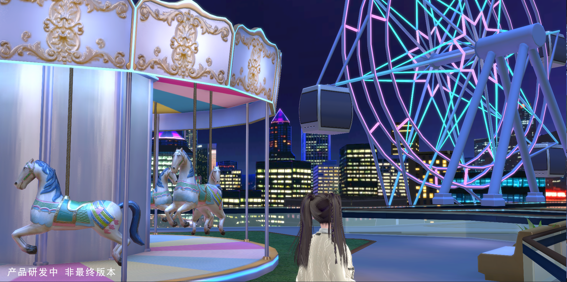 整个游乐场位于城市中心湖之上,四周被高楼建筑环绕。情侣们总喜欢在夜晚出行,在游乐场里放下一天的疲惫。地图的主要交互场所有两种——旋转木马和摩天轮。旋转木马是很多人记忆中的模样,各式大小被装点精致的小马驹,通过金属杆连接跟随着音乐转动;摩天轮的承载钢筋装上了青紫色的灯带,随着设备的启动在夜空中闪烁绚丽色彩,据说在摩天轮最高处接吻,寓意着两人生生世世,幸福永存。舞者们通过完成任务或活动获取游乐场门票,即可与场景互动,骑上小马驹享受浪漫,登上摩天轮一览江景。