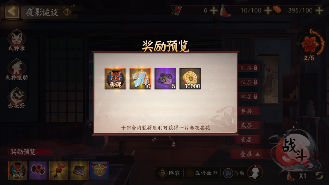 阴阳师在单场战斗中10回合内胜利将获得一片赤夜昙花,每集齐5片赤夜昙花即可领取额外奖励。