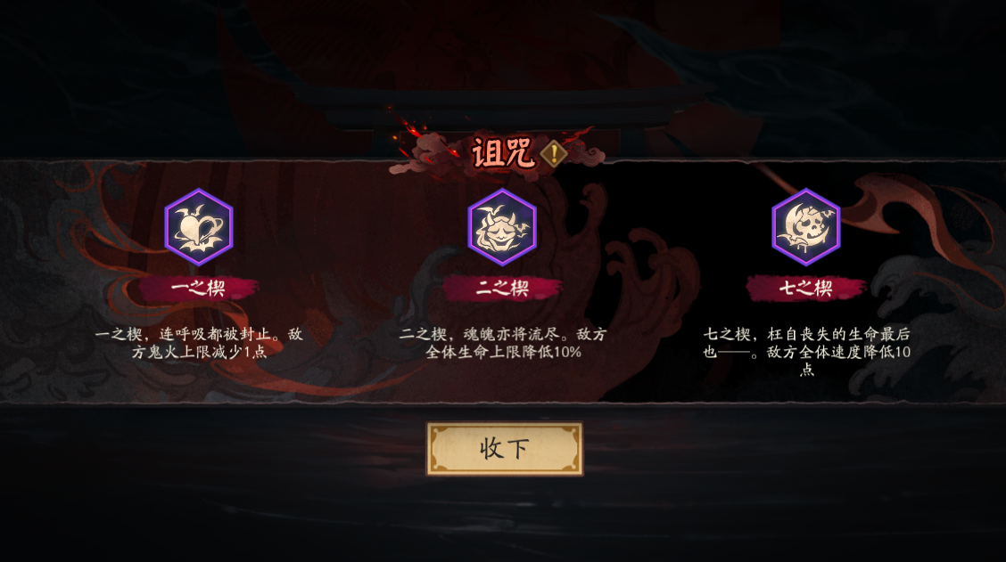 每场战斗胜利后,阴阳师们可从敌方阵容中选取一位式神或者获得敌方的「诅咒」,获得重复「诅咒」时,「诅咒」效果升级高阶「诅咒」。