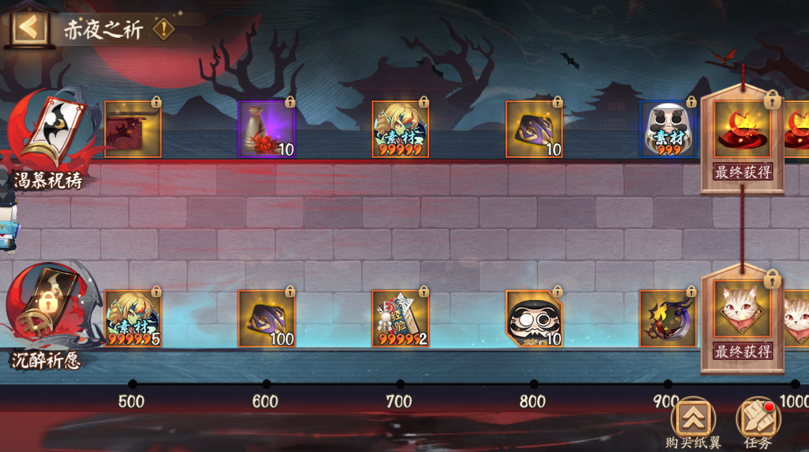 活动期间,阴阳师们通过参与活动玩法可完成「每日任务」获取「纸翼」。通过收集「纸翼」达到对应等级即可获取「夜之印」「赤月印券」「赤月谜影」名染样式及点触效果等奖励。