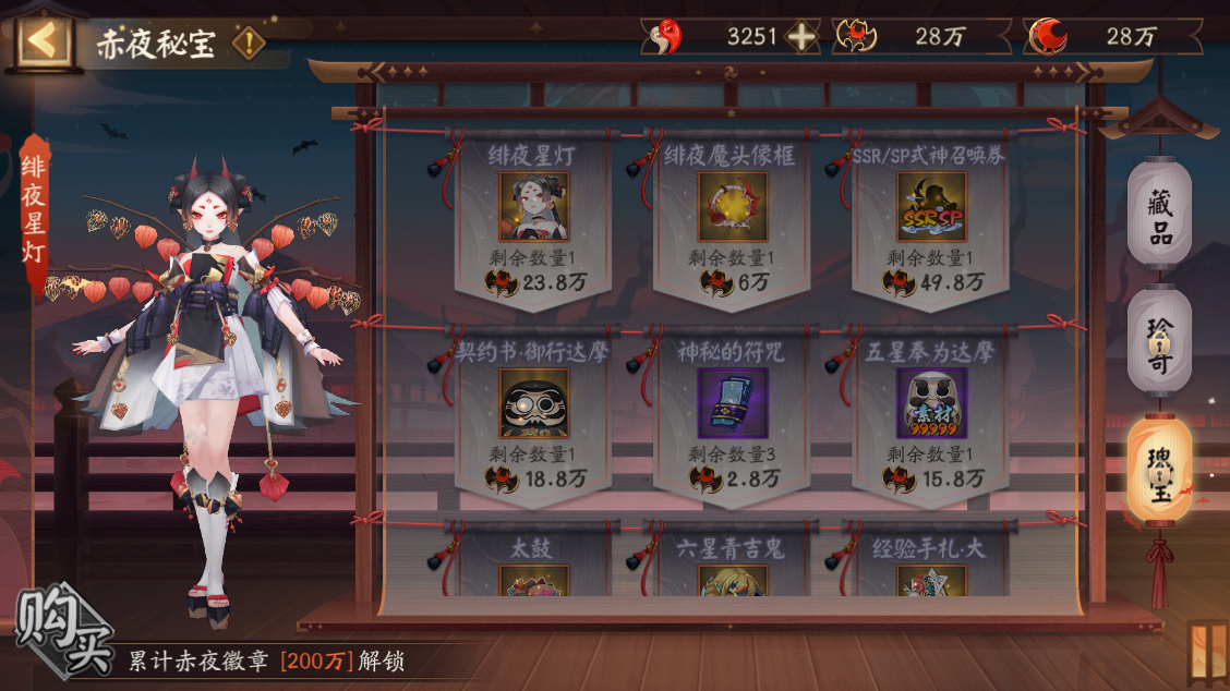 阴阳师们通过消耗活动中获取的「夜之印」可在「赤夜秘宝」中解锁兑换SSR/SP式神召唤券、御行达摩、神秘的符咒、吸血姬皮肤•绯夜星灯、限定动态头像框「绯夜魔」等丰富奖励。