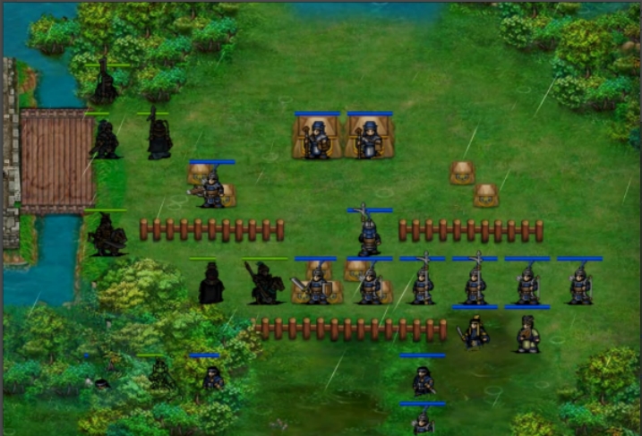 3.靠近鹿砦果然出现了伏兵,7名弓箭手加荀禹并加全能,靠近鹿砦,要全灭那个弓箭队,必须先干掉荀禹,不然小兵无限复活,鹿砦上方的平原出现一队刀兵加四名策士,第五回合孙奂带援军从右上角来支援。