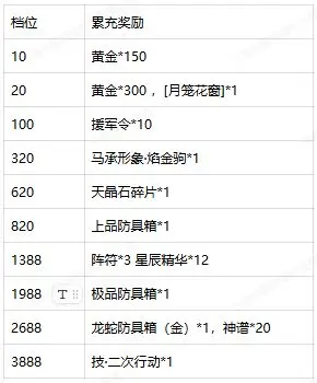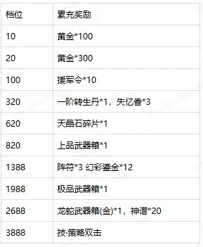 【活动详情】春节月累充档位和奖励升级!且月累充金额超过8888档位之后,再充值到对应档位可重复领取1轮月累充奖励~第2轮需要联系客服登记领取!第二轮8888可选择特技为:金刚不坏、千锤百炼、战意昂扬、因地制宜、或618元礼包特技自选。