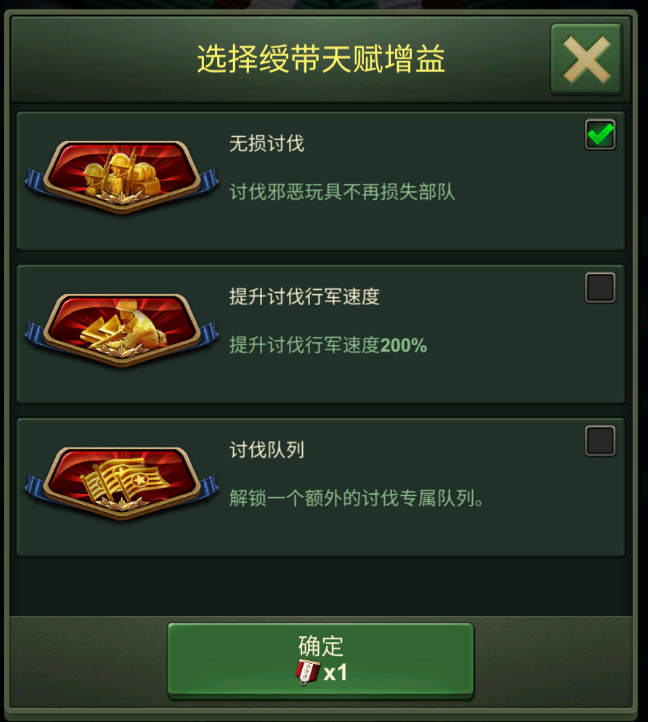 在游戏的第一个讨伐绶带天赋中,我们可以选择无损讨伐这一天赋。点出无损讨伐后,我们在讨伐的过程中将不再消耗一兵一卒,也就不需要担心没打过被全军覆没啦。