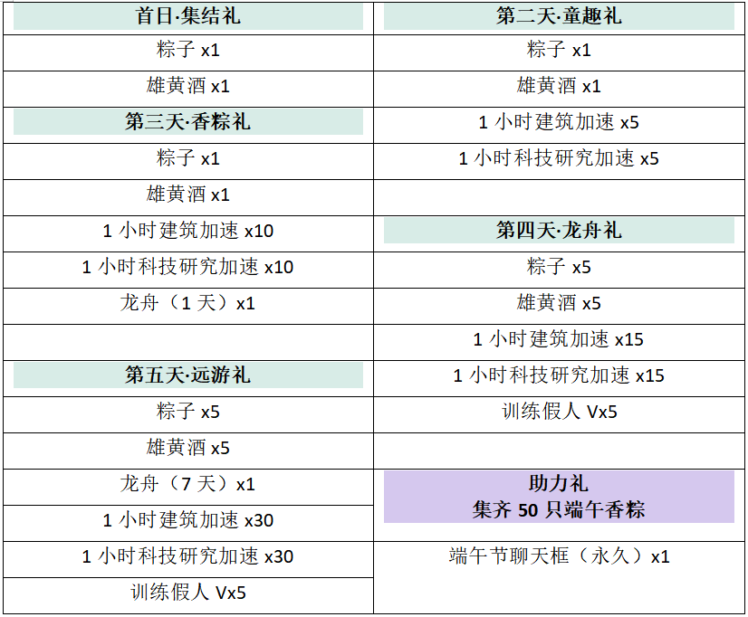 在活动期间,每天都可以登录活动页面签到领取包含海量资源的节日好礼!通过分享、助力等行为获还可得活动道具端午香粽,集齐50只即可获得【端午节聊天框(永久)】一个!快来一起远游吧!六一儿童节当日参与活动还可以获得额外的端午香粽哦!