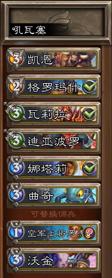 吼瓦队具体分两套阵容,吼瓦萨和吼瓦塞两套,后备大部分是凯恩+菠萝+曲奇,也有自然队后备(玛法里奥+布鲁坎+曲奇)、暗影队后备(沃金+塞林)等等。我们这边重点推荐吼瓦塞,配最常见的凯恩菠萝曲奇。