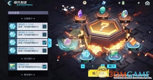 2、普通插件则是能消耗罗马石与各类属性石,增加指定位置和副属性词条的生成概率,消耗四色石还能使插件至少拥有1条评价A以上副属性词条。若是不放置偏好提升材料,也可以进行插件制造。