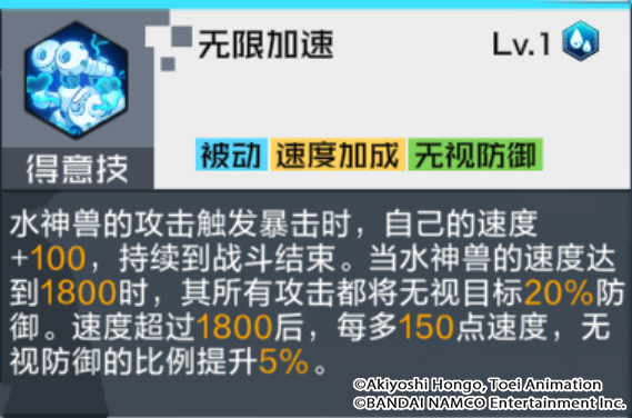 技能解析:水神兽产生暴击时可以获得一定的速度提升,水神兽可以从速度属性中获得高额的无视防御,最高可完全无视目标防御。