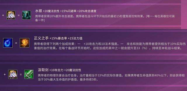 一费卡亚索的三件套是水银、正义之手和汲取剑,其中水银是最为核心的装备,毕竟要是对面有个卑鄙之风,那不就是game over了。别的装备也可以代替列如:巨人捕手、无尽或者锐利都行。