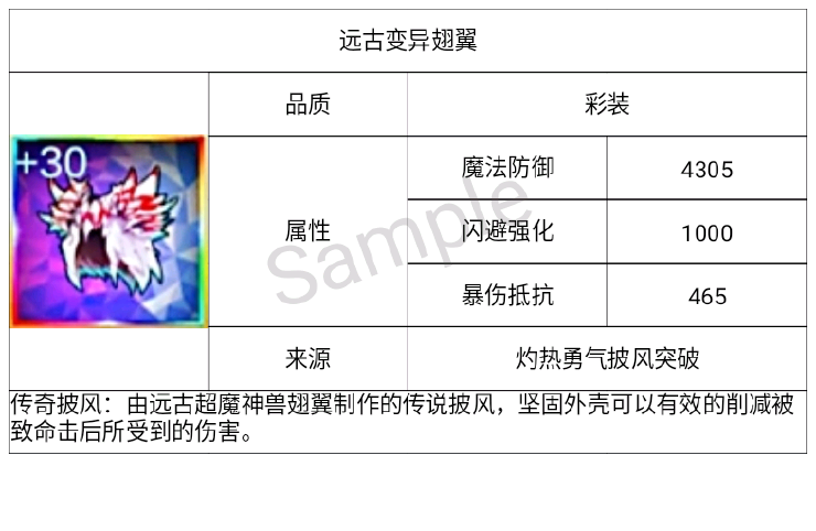 传奇披风:由远古超魔神兽翅翼制作的传说披风,坚固外壳可以有效的削减被