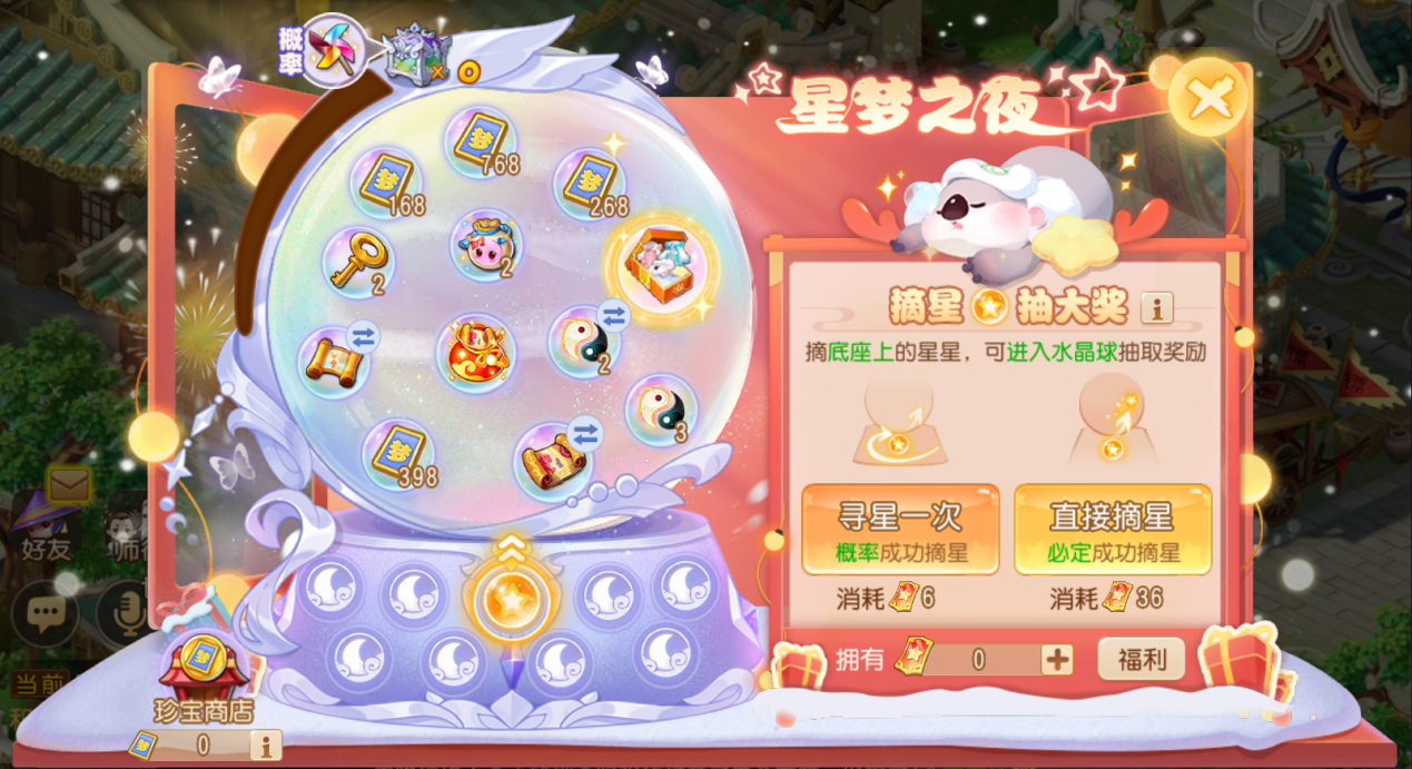 玩家可通过积累活跃度或完成日常任务获取筑梦币进行寻星,也可以通过花费仙玉兑换筑梦币直接摘星。玩家每获取一份奖励后,将为水晶球注入一定能量值,当水晶球的能量值满后,玩家还可额外领取一份神秘宝藏哦!此外,在“星梦之夜”活动内置珍宝商店中,玩家还可以购入全新萌眼罩、星夜梦游足迹、绒绒睡梦冒泡框等超萌饰品,更可以兑换嘉年华珍宝五彩风车和月华结晶哦!