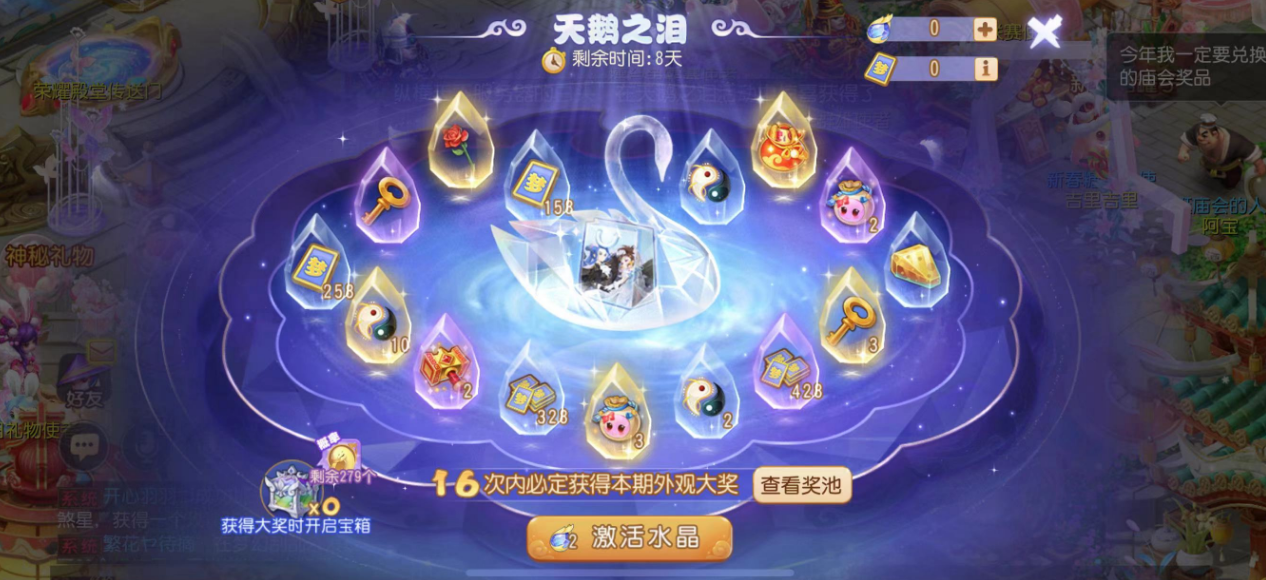 此外,玩家每次参与抽奖时,除获得不重样的奖池奖励外,还有机会额外获得水晶宝箱。当玩家抽中全新外观大奖后,将可一次性开启已获得的水晶宝箱,赢取稀有双人坐骑天鹅船、如意锦囊等幸运奖励哦!