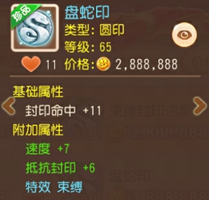 封系门派若是更看重封印命中,盘蛇印基础属性可优先选择封印命中,其次选择星盘特效束缚有概率提升封印效果,延长封印时间一回合。