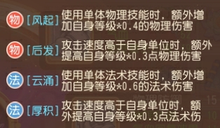 后发和厚积主要是针对物理系和法系门派进行伤害提升。在目前输出门派多以群体伤害为主的情况下,风起、云涌适用于点杀或单体伤害的加成。