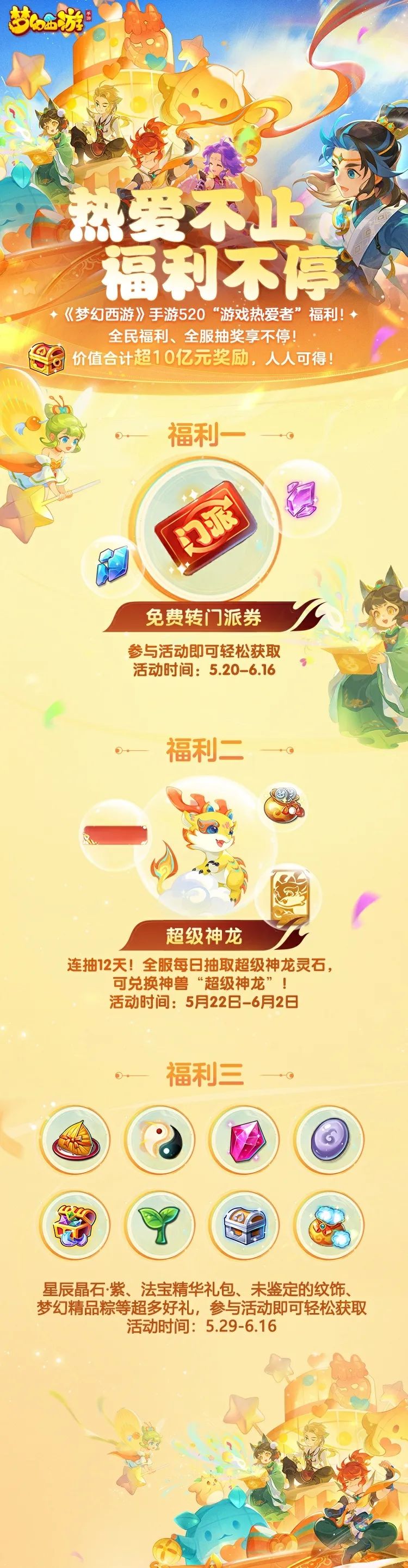 今年是网易游戏520游戏热爱日的十周年,《梦幻西游》手游热爱不止,福利不停!在这特别的日子里,《梦幻西游》手游也为一直支持我们的玩家送上满满的福利!全民福利,全服抽奖,统统安排!一起来看一下吧!