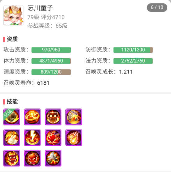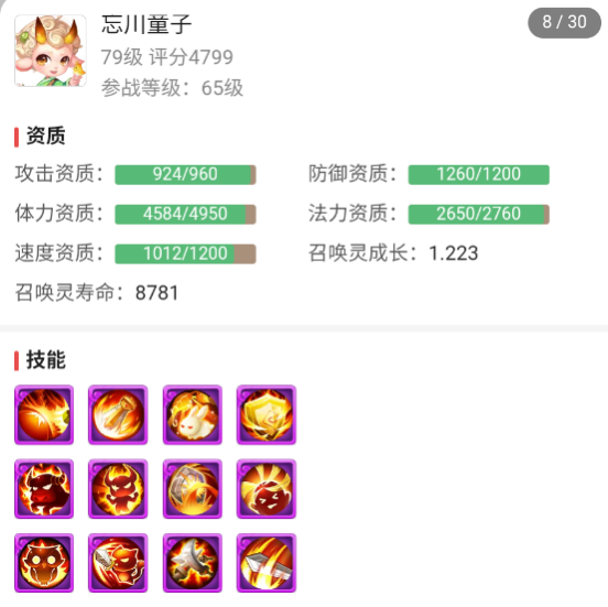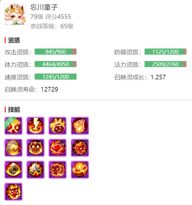 12技能忘川童子,资质高,成长高。技能配置上,不仅生存能力了得,还有高级连击+高级必杀+高级强力提高输出伤害,可谓是攻防一体!