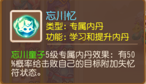 另外还有5级专属内丹忘川忆效果,就算不慎被击败,也有50%概率给击败自己的目标附上失忆符状态,错乱其施法目标。