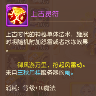 上古灵符作为单体法术技能,无论是附加高伤害的怒雷效果,还是有一定几率导致目标封印2回合的冰冻效果,都能为战局带来意想不到的惊喜!