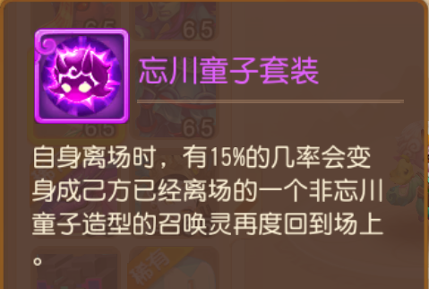 还有忘川童子专属套装,自身离场时,有15%的几率变成己方已经离场的一个非忘川童子造型的召唤灵再度回到场上。如此一来,便给战局带来了更多未知惊喜~