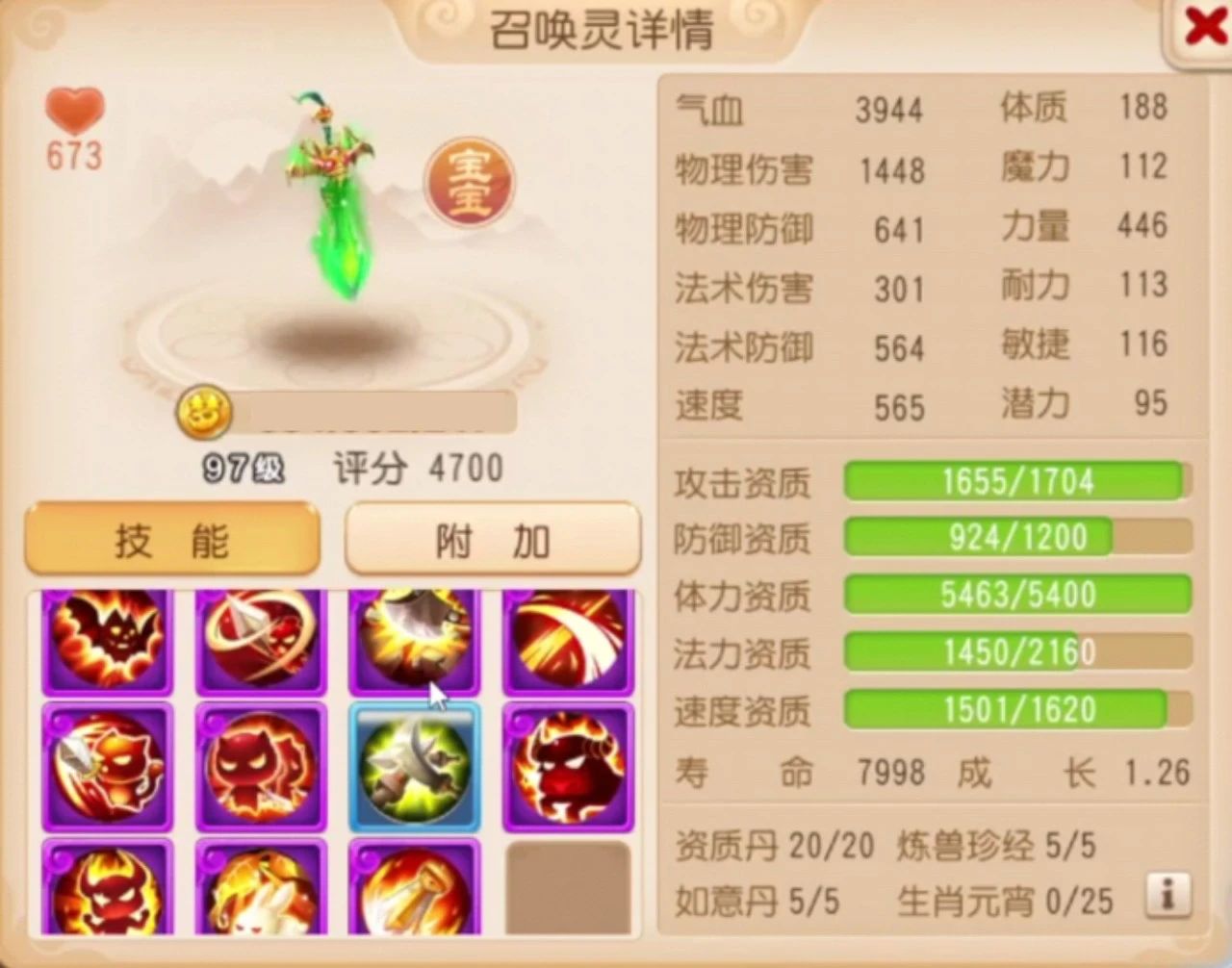 体力资质4031/5400,法力资质1639/2160