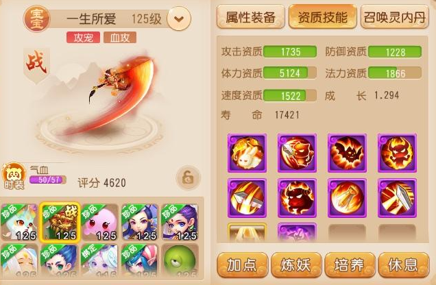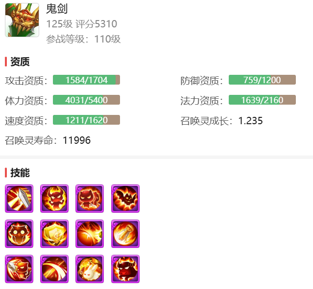 真没看错,这是一只接近1.3满成长的8技能鬼剑,搭配上1735攻击资质和1522速度资质,不仅资质高,技能打书还相当完美,反击一下吸满血的感觉你值得拥有!