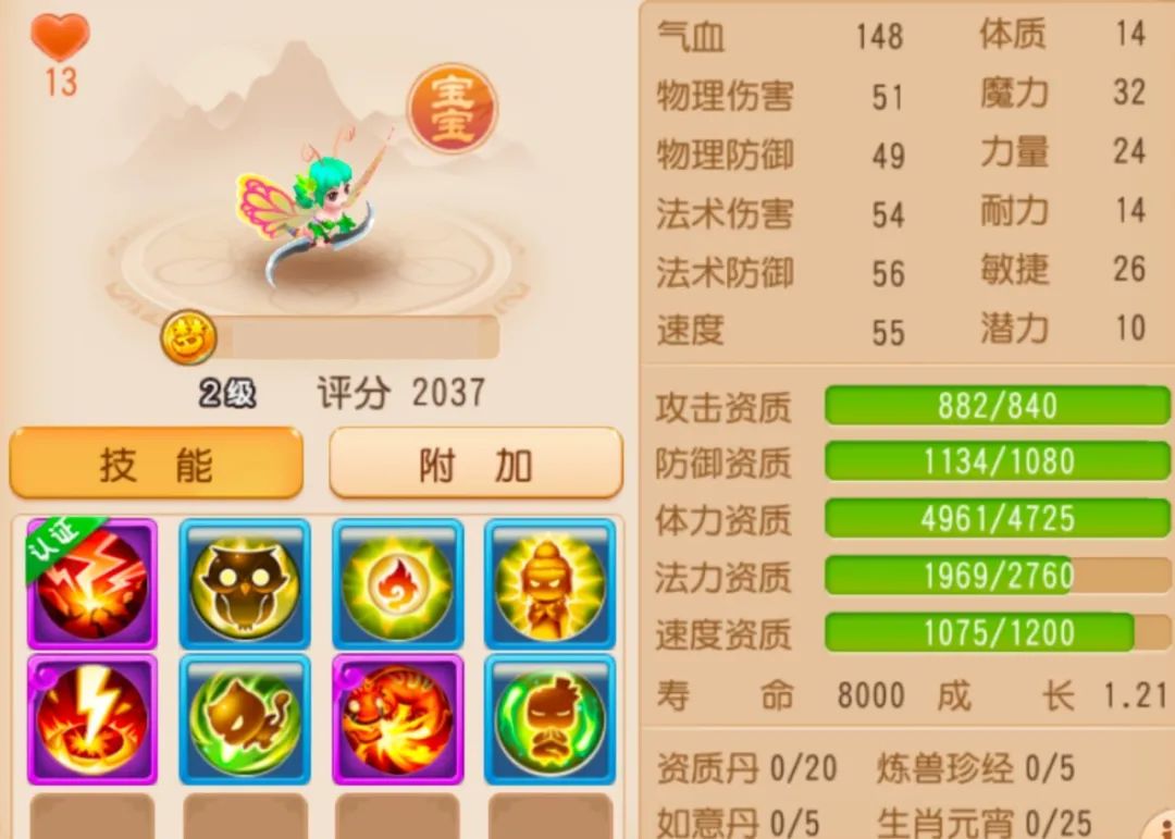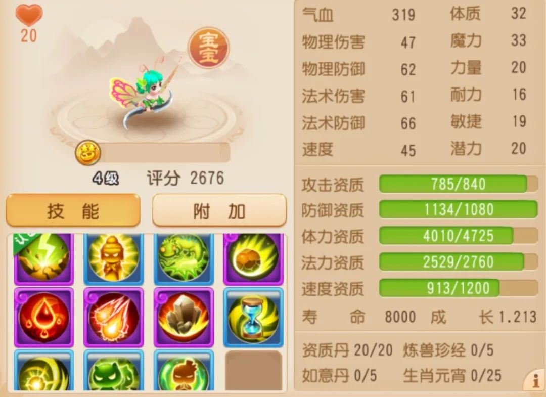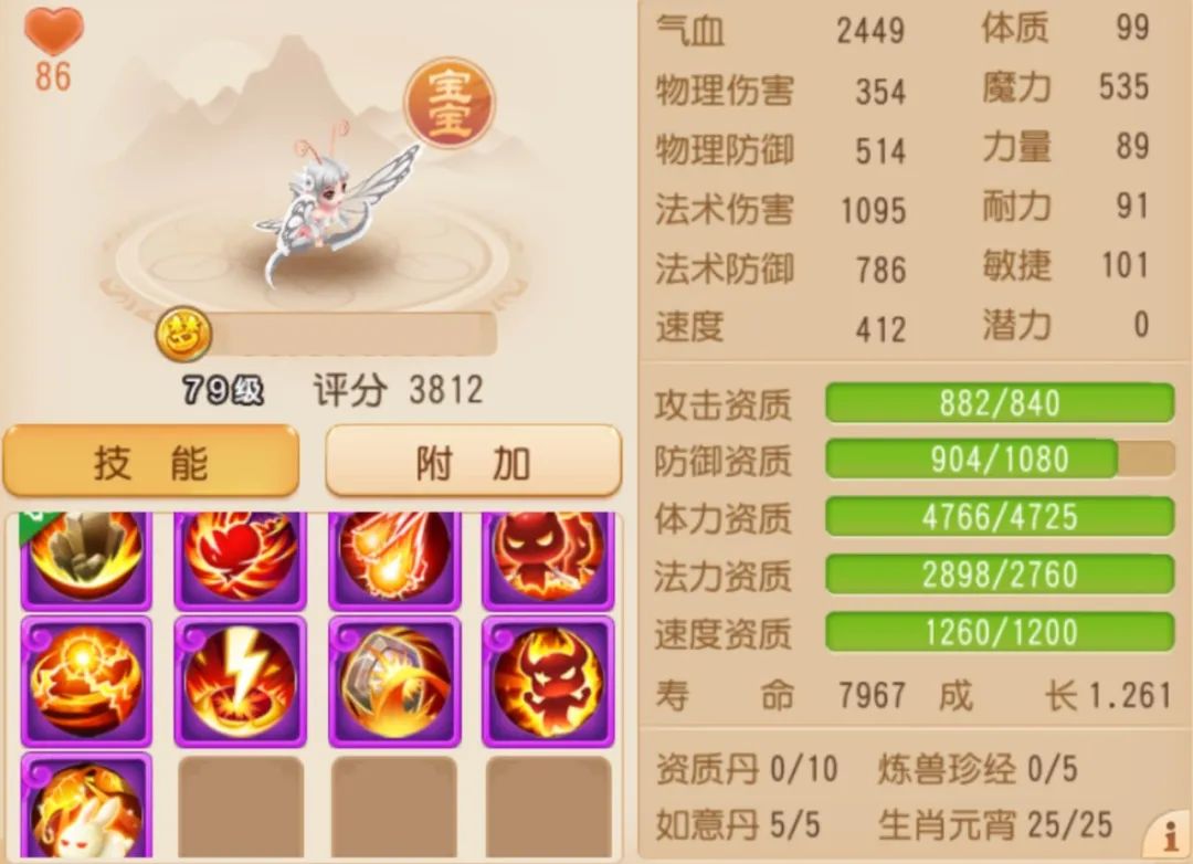 这只认证9技能全红蝴蝶仙子,资质、成长无可挑剔!除了防御资质外,其余资质都已突破上限,成长更是高达1.261,初始属性点也都集中在体质、魔力、敏捷上,堪称完美。