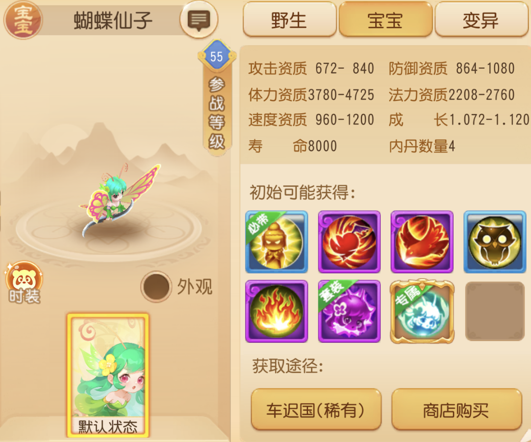 蝴蝶仙子定位为55级稀有法系召唤灵,拥有出色的体力资质(上限4725点)与法力资质(上限2760点)。