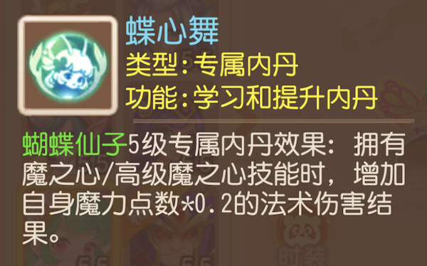 专属内丹蝶心舞(5级):拥有魔之心/高级魔之心技能时,增加自身魔力点数*0.2的法术伤害结果。