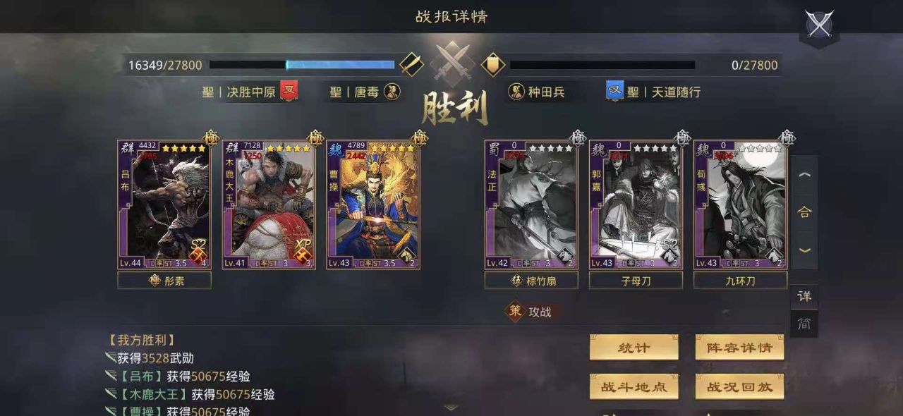 武将选用了神级辅助曹操,这里曹操也可以使用其他的步兵或者骑兵前锋武将。中军木鹿和鬼吕双核输出弥补大营战法不足导致的输出不足。
