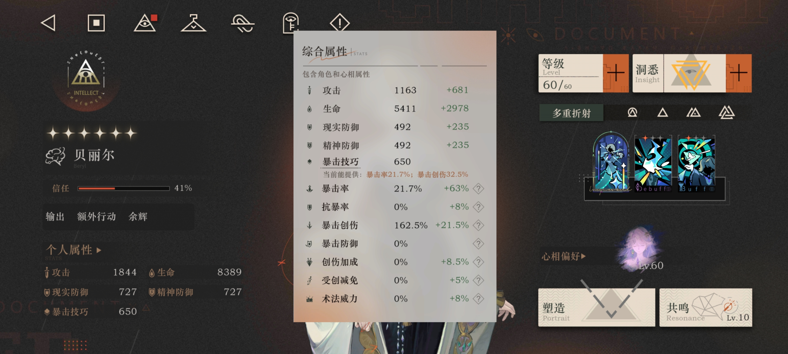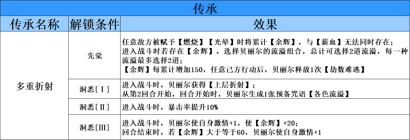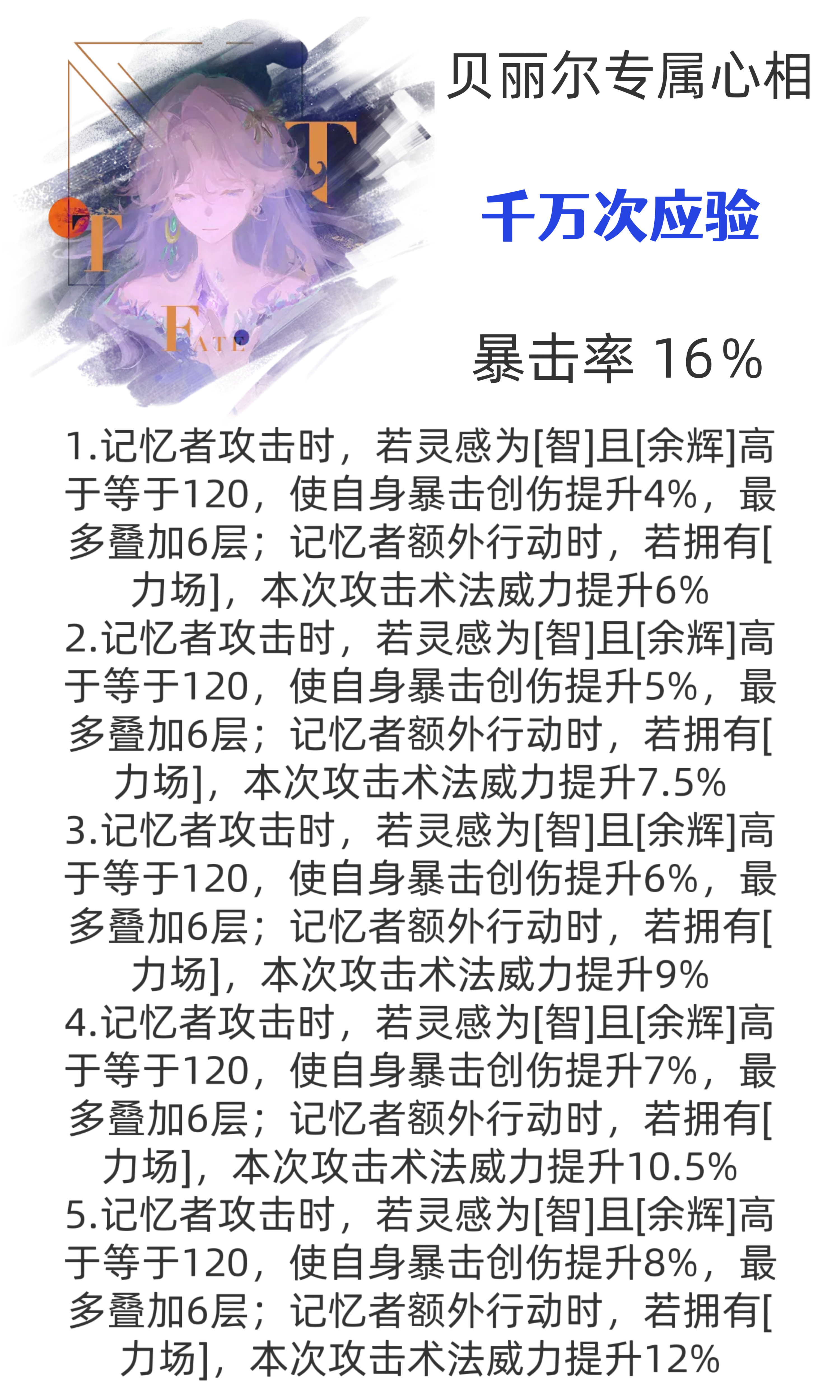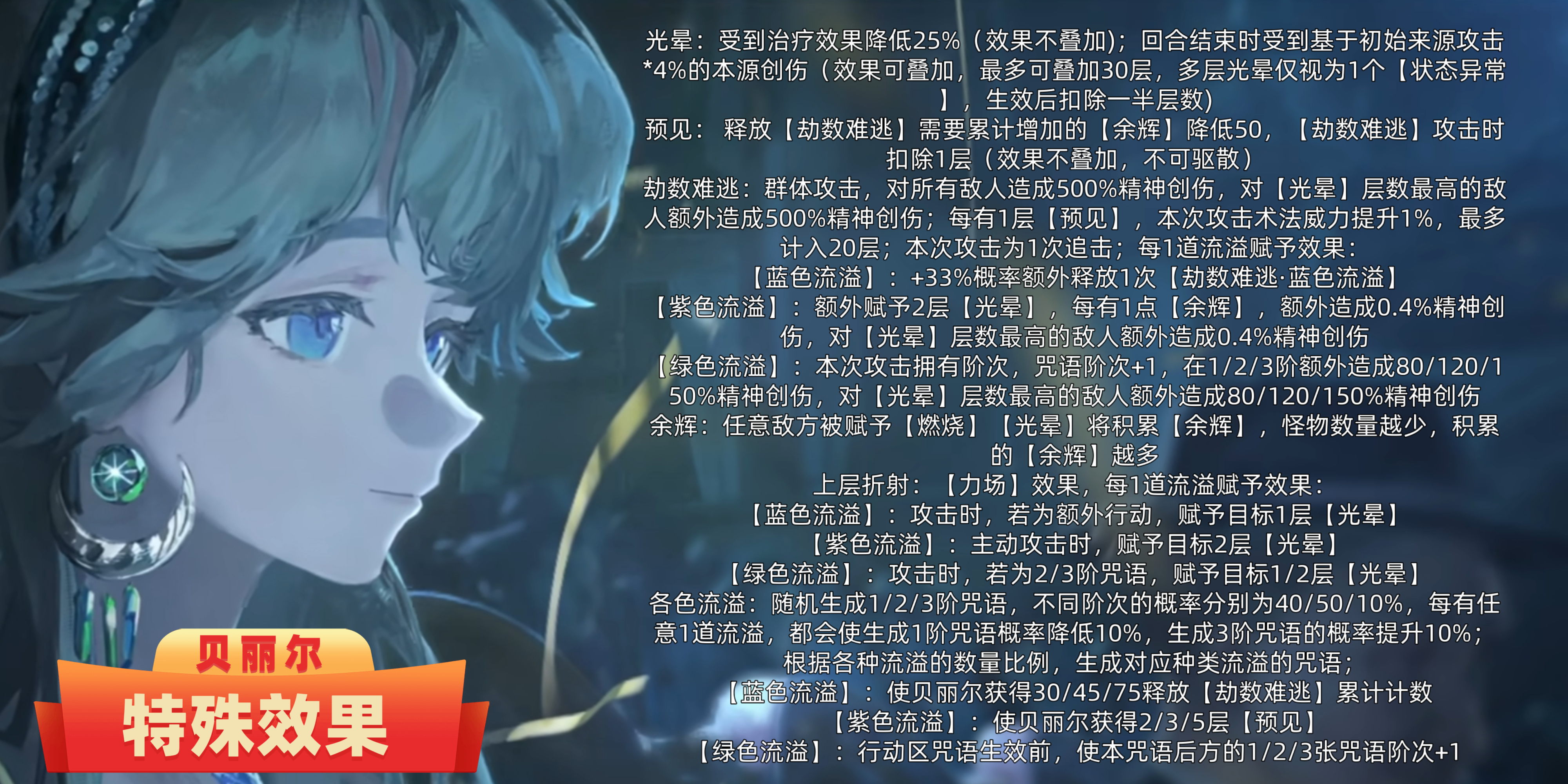 这个提供16%暴击率,让贝丽尔可以保证高暴击伤害来平衡并不是很高的一个倍率带来的短板。且拥有120层以上余辉还可以叠加一个暴击创伤,利于其输出!同时【在劫难逃】是属于额外行动的,这样在释放的时候还有伤害加成!