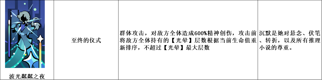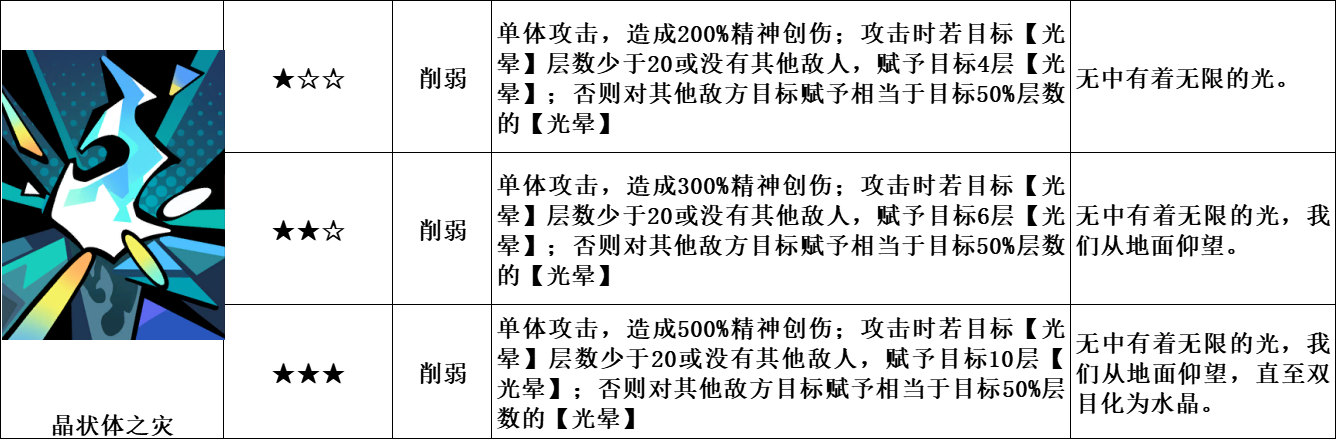 首先倍率不是主要考虑的因素(这个伤害主要是靠追击打),主要是光晕的赋予可以快速叠加【余辉】层数来打追击。但要注意的是,这个在20层以下或者是没有其他人才可以赋予这个光晕,否则就是给其他角色上光晕。虽然光晕有着一定的伤害,but如果是全部给主目标伤害反而会收益不佳。