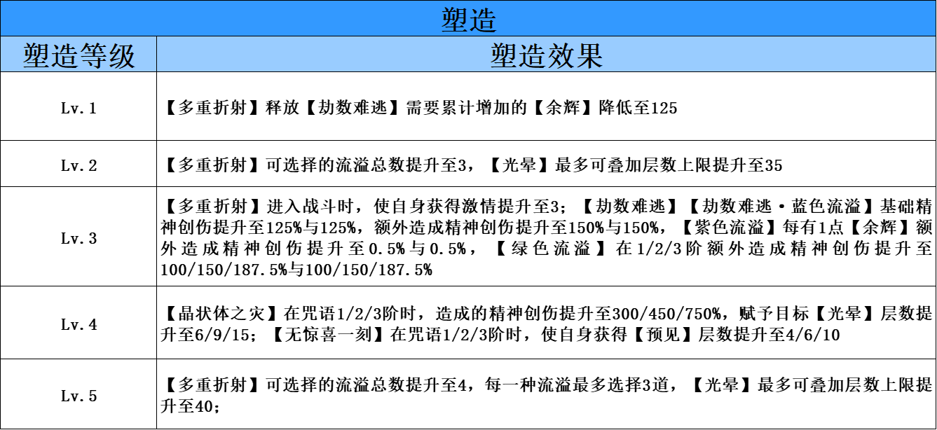 塑二就是一个很关键的塑造!第一个是扩展了流溢上限,这样你可以all in体会到极致的乐趣(一方面是输出变好了,另一方面可以体会抽卡的刺激√),同时光晕上限增加也使得伤害有更进一步提升