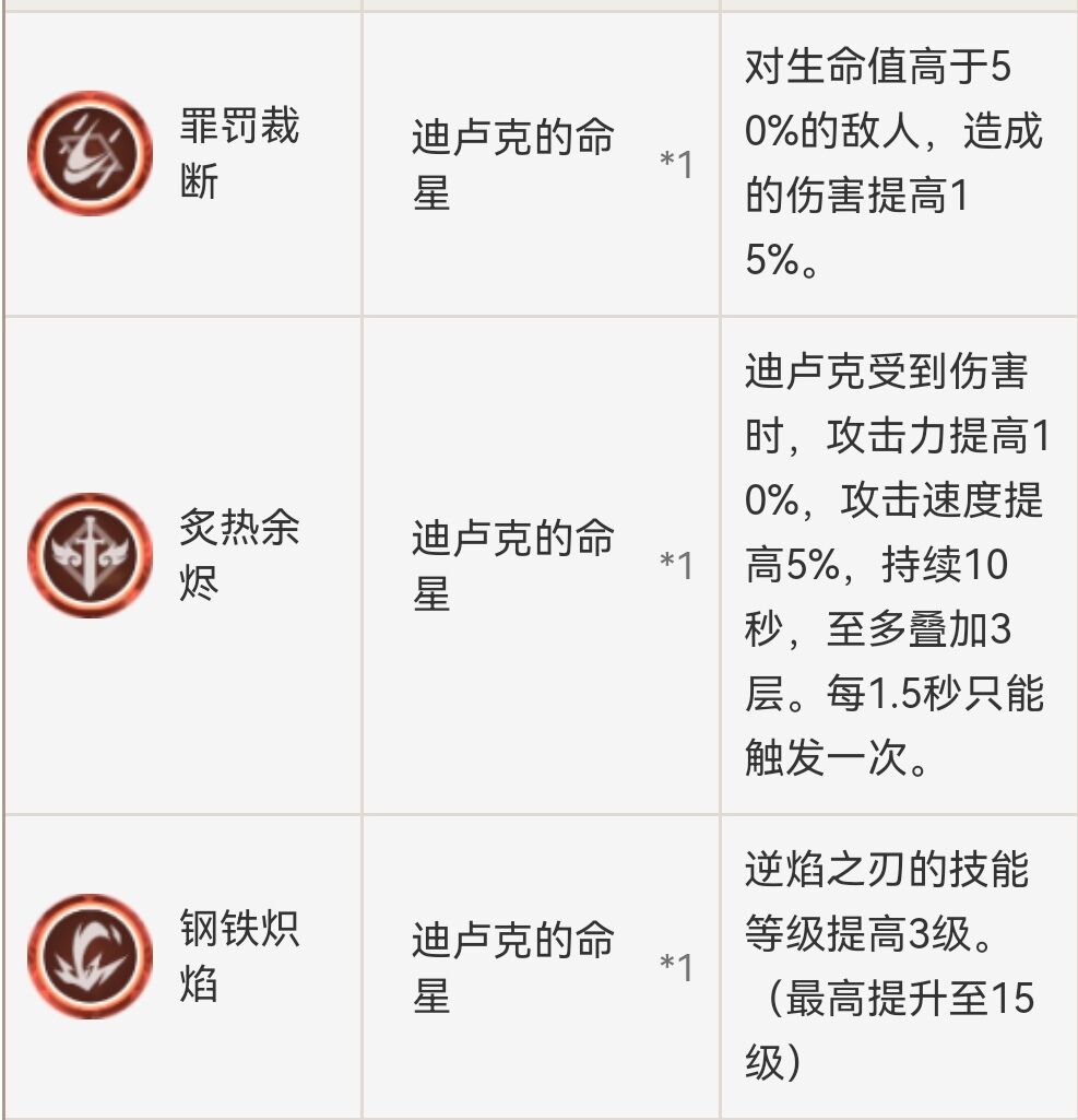 迪卢克的命之座提升非常平滑,一命简单粗暴的伤害增加,二命的受伤提高攻击力和攻速,四命的元素战技增伤以及六命的普攻增伤。在频繁使用迪卢克的前提下,这样优质的命之座歪到就是赚到。