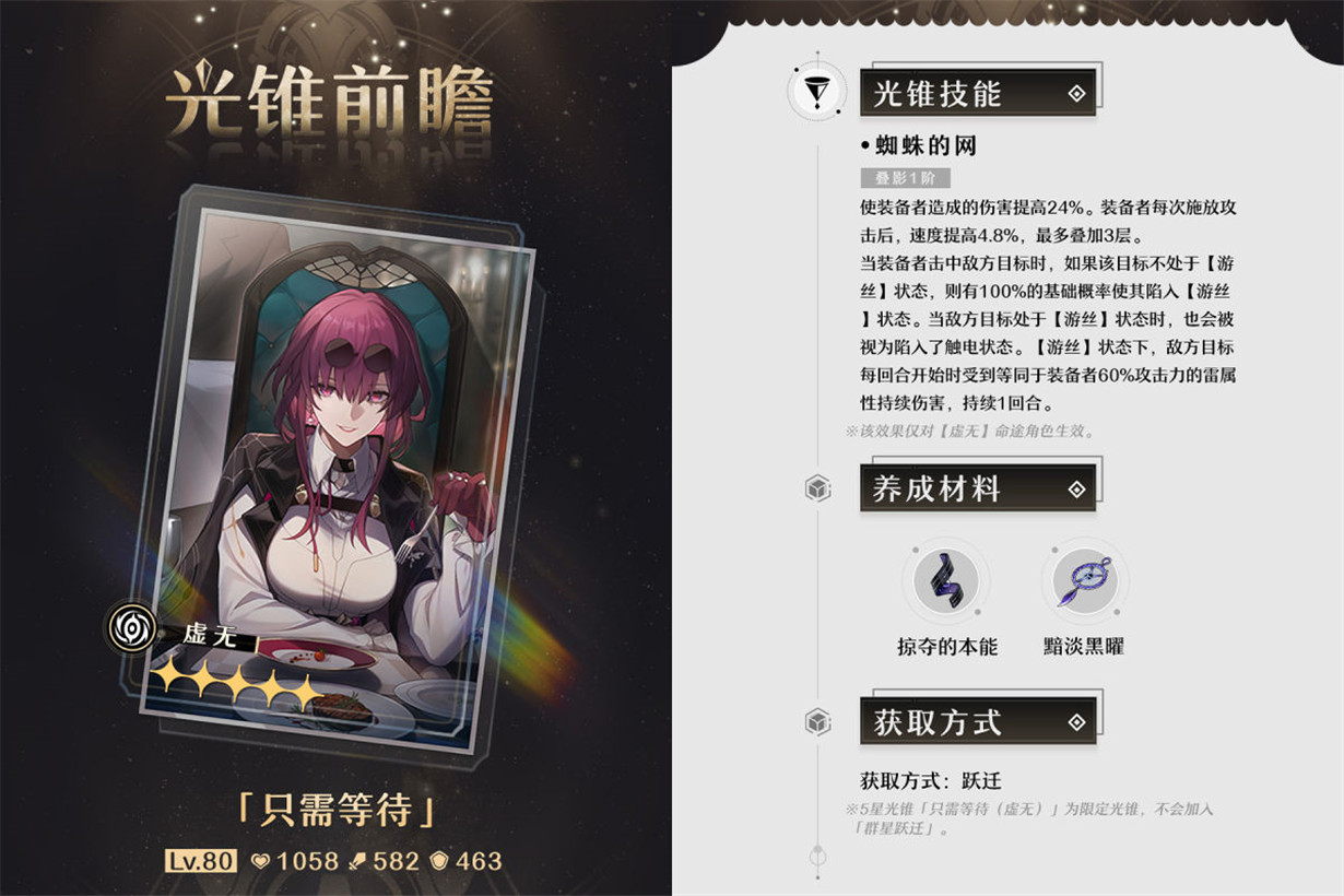 只需等待,满级面板1058生命值、582攻击力和463防御力,和另一个五星虚无光锥“以世界之名”面板相同,三项属性都属于虚无光锥里最高的一档。叠影1特性为:24%全增伤;每次释放攻击提速4.8%,最多3层;以及击中敌方时,有100%基础概率使其陷入视作为触电状态的“游丝”机制。