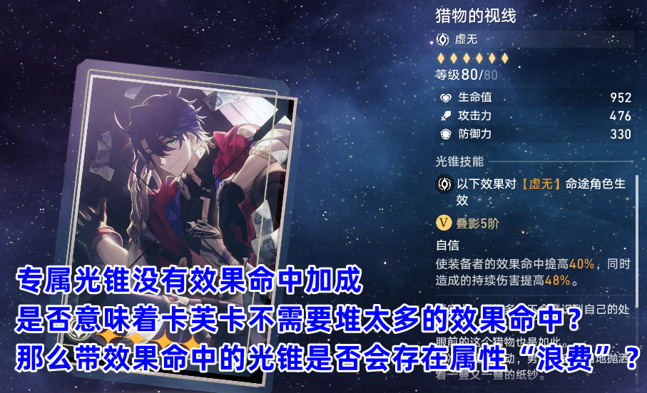 而“游丝”更是包括遗器在内都没有的独特机制,额外的触电自然也能增加卡芙卡的伤害。另外还有个小细节,只需等待没有提供效果命中加成,有可能暗示卡芙卡本身不需要堆太多效果命中,所以相比那些有效果命中的光锥,只需等待的各项属性提升更加不可能“浪费”。