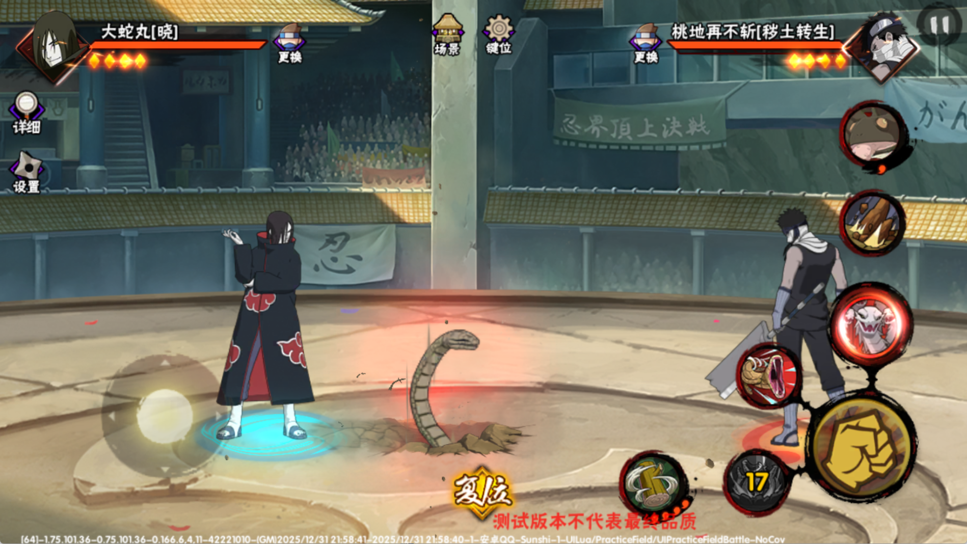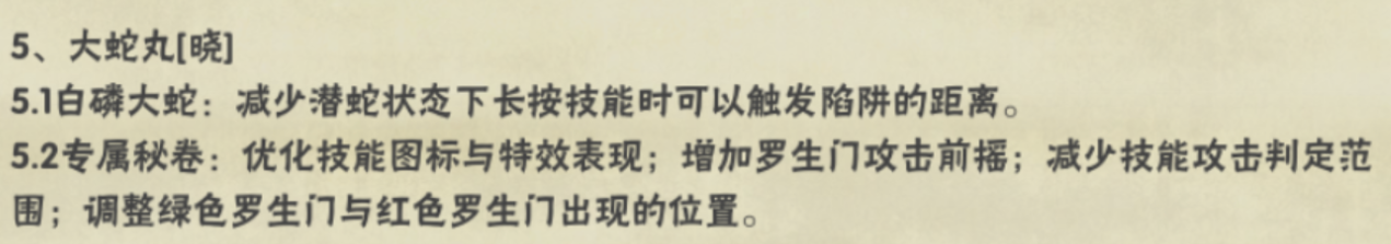 先来说首次上线体验服的晓大蛇丸改动吧,这个忍者很多人猜到了是会削弱专属秘卷罗生门,但策划偏不按套路出牌,除了专属秘卷罗生门的改动,还削弱了一技能潜蛇状态下长按陷阱触发的范围,这算是秘卷和技能全被削弱了。