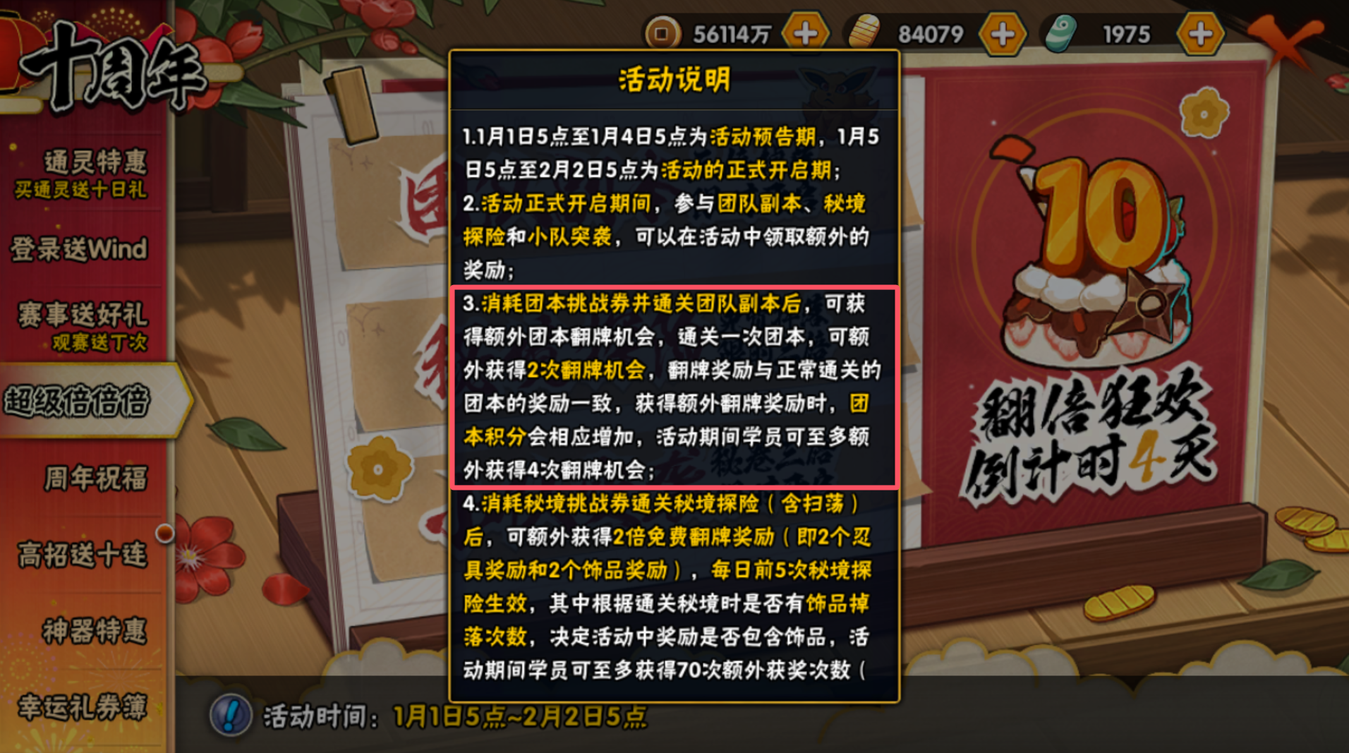 这个活动主要是团队副本、小队突袭、秘境探险有翻倍掉落,这确实是一个好活动,但问题就在于这个活动是到2月2日,不少人觉得这一波策划良心了,居然是开启一个月,我刚开始也是这么认为的,但当你点开下面的感叹号才知道原来没那么简单。