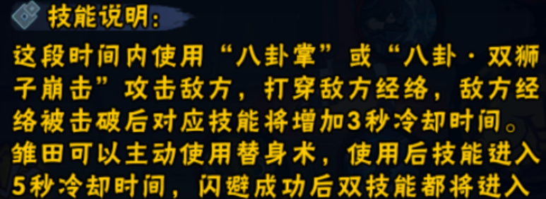 通过游戏内出现的机制说明,我们可以提前看到重做后的最终章雏田大概机制,简单来说就是这个忍者新增了一个白眼强化机制,通过白眼看到对方的破绽以及打穿对方的经络,而且还有强化技能的表现,除此之外就是主动替身闪避的机制。