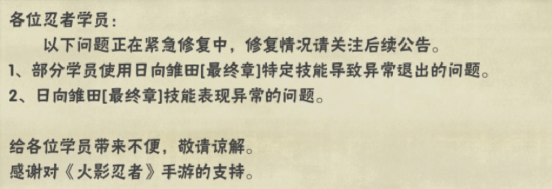 截止到我写这篇文章,游戏内临时增加了一个公告,策划已经发现了这个忍者存在的问题正在修复,估计很快就会回调到老版本了,感觉是临近放假了,工作人员有点粗心大意,也正因为这样一个小的失误让玩家提前看到了这个忍者的重做方案。