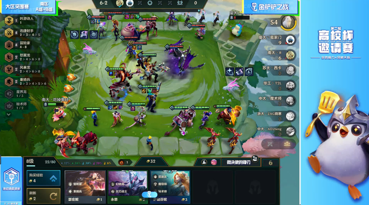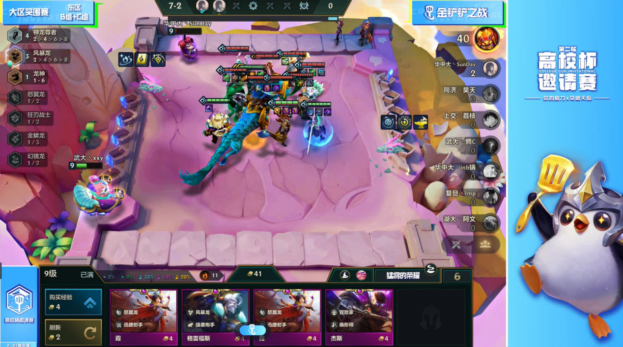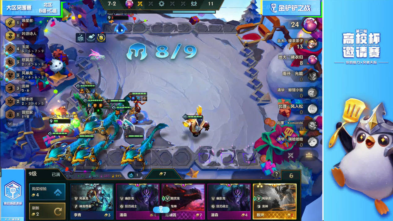 山东大学小涵神晋级选手中唯一中唯一的女学霸,在北区B组+C组比赛中选择的是四龙敖兴阵容,且7-2阶段追出3星敖兴,大家也知道3星8费龙神棋子是多么难3星的,且还是在快节奏的比赛局中,小涵神的经济运营能力让人折服,真的是巾帼不让须眉。