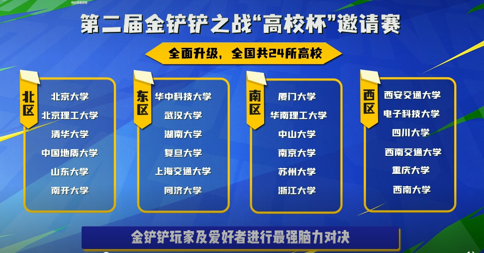 这届次金铲铲高校杯,有24所顶级高校的学子们参加角逐。由地域区分为东、南、西、北四大赛区,每个赛区只有两个晋级名额。