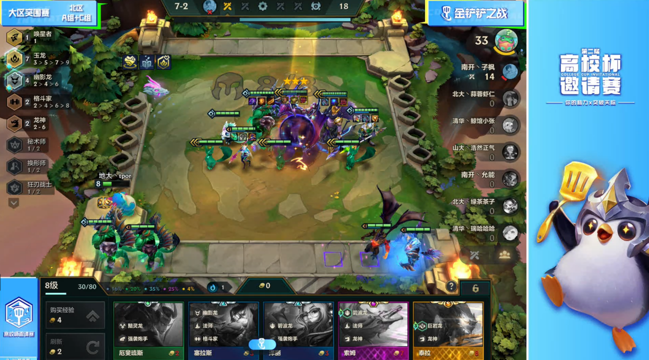 地质大学tpor实力也是不俗,在北区A组+C组比赛中选择的是玉龙赛芬阵容,大家知道,这套阵容在铲铲当前环境中上限其实不算太高,属于吃分稳定,但吃鸡较难的阵容,但地质大学tpor在对局中选择了7玉龙+4幽影的羁绊搭配稳血过渡到后期追出了3星潘森挺进决赛圈,大后期更是7-2阶段更是追出3星赛芬,双3星直接锁定胜局。